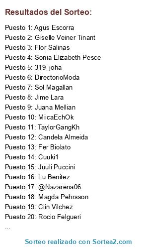 Lista de participantes: Lula Nieto , Elsa Cassano , Carina Graziano , Paulina Soto Martínez , Flor Ayala Martinez , Fer Biolato , Sonia Elizabeth Pesce , Petu Rodriguez , Lu Benitez , Juuli Puccini(2 participaciones), Florencia Maero (2 participaciones), Daii Soloa , Soledad Aimone, Emilia Maero, Nuni soria, Giselle Veiner Tinant(4 participaciones), Majo Ochoa(2 participaciones), Candela Almeida, Tiki Vilches, Luci Spies(2 participaciones), Viki Coria Alvarez(2 participaciones), Delfi Lucena, Mica Pollo, @dess_sort23, Debo Navarro, Agus Calderón, Yami Navarro, Aye Lopez, Rocio Felgueri, Juana Mellian, Cande Baque(3 participaciones), Flor Salinas, Rocio Bonetto, Marce David, Ciin Vilchez, DirectorioModa, Fiore Nicola(2 participaciones), Nati Giordano, Cami Damilano(2 participaciones), Agus Escorra, Magda Pehrsson, Lia Tolettini(2 participaciones), Jime Lara, Sole Forastello, carlapinto23, MiicaEchOk, lucia_noble, Cele Resina, Lu Trangoni, lau_plazas, Agustina Brizzio, Marysol Ponce, Martu Alfonso, Sol Magallan(2 participaciones), TaylorGangKh, 319_joha, Cuuki1 , Miss_Compras, Vero Troconis, Viicki Hernandez, Andre Aguirre, Ine Leiva, Fedee Peraltaa, Magui Aguilera, @FioSombra, @Nazarena06.