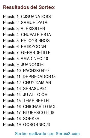 Lista de participantes: AMADINHO 10, OOSORNIO23, CHUPATE ESTA, TEMP BEETH, JUANO1016, CJGUANATOSS, CHUY DAMIAN, CHICHARITO MX, BLUEESCOTT18, DEPREDADOR13, ALEXIS9TEN, PELOYS BROS, SEBASUP94, SAMUELZATA, PACH3KO420, JU AL TO OR, SOEK89, ERIIKZOONN, GERARDELIITE.