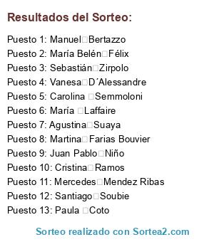 Lista de participantes: Juan Rodil, Macarena Manavella, María Belén Félix, Rocio Garre Trabaledo, Mercedes Spinosa, Sebastián Zirpolo, Maria Julia Arango, Bárbara Baumann, Camila Exposito, Martina Farias Bouvier, Mercedes Mendez Ribas, Alejandra Vergara, María Boix, Celeste Arango, Rocío Castro, Nicolás Dal Maso, Josefina Granados, Jesús Dávila, Yanina Fasio, Darío Benítez, Rodrigo Gonzalez Pereira, Kevin Mónaco, Mariana Morales, Juan Pablo Niño, Paula Ospina Aristizabal, Cristina Ramos, Santiago Lacroix, Julia Pomares, Ángeles Olaciregui, Sebastián Lew, Clara Popeo, Alejandro Sáez, Melina Nacke, María Victoria Marco, Santiago Soubie, Megan Ballesty, Pablo De la Vega, Ricardo Carciofi, Ramiro Albrieu, Manuel Bertazzo, Carolina Tchintian, Belén Abdala, Martín Bohmer, Luciana Petrone, Paula Szenkman, Gabriel Kessler, Manuel Mera, Gala Díaz Langou, José Florito, Juan Camissasa, Florencia Caro Saccheti, Carola Della Paolera, María Laffaire, Emiliano Arena, Natalia Aquilino, Juan Scolari, Agustina Suaya, Manuel Vilardo, Demian González, Jimena Rubio, Paula Nuñez, Laura Zuvanic, Gonzalo Dieguez, José María Gasparín, Lucía Aruanno, Esteban Torre, Alejandra Cardini, Josefina Peire, Jennifer Guevara, María Eugenia Bucciarelli, Iván Matovich, Paula Coto, Carolina Semmoloni, Agustina Ollivier, Carla Paparella, Vanesa D´Alessandre.