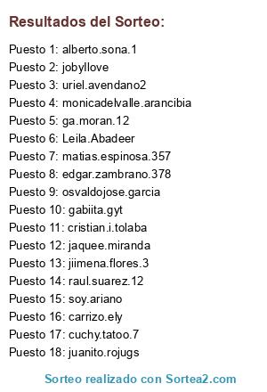 Lista de participantes: alberto.sona.1, carrizo.ely, cristian.i.tolaba, cuchy.tatoo.7, edgar.zambrano.378, ga.moran.12, gabiita.gyt, jaquee.miranda, jiimena.flores.3, jobyIlove, juanito.rojugs, Leila.Abadeer, matias.espinosa.357, monicadelvalle.arancibia, osvaldojose.garcia, raul.suarez.12, soy.ariano, uriel.avendano2, .