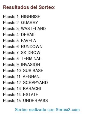 Lista de participantes: AFGHAN, DERAIL, ESTATE, FAVELA, HIGHRISE, INVASION, KARACHI, QUARRY, RUNDOWN, SCRAPYARD, SKIDROW, SUB BASE, TERMINAL, UNDERPASS, WASTELAND.