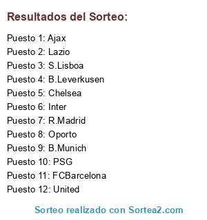 Lista de participantes: S.Lisboa, Chelsea, FCBarcelona, B.Munich, Inter, Ajax, United, R.Madrid, PSG, Oporto, B.Leverkusen, Lazio.