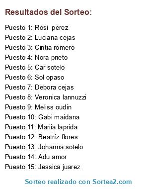 Lista de participantes: Jessica juarez, Mariia laprida, Gabi maidana, Cintia romero, Nora prieto, Debora cejas, Rosi perez, Sol opaso, Luciana cejas, Car sotelo, Johanna sotelo, Veronica lannuzzi, Meliss oudin, Adu amor, Beatríz flores.