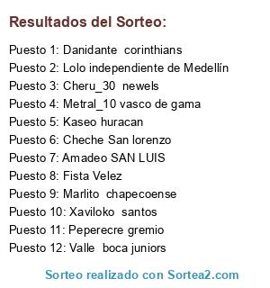 Lista de participantes: Xaviloko santos, Marlito chapecoense, Danidante corinthians, Cheche San lorenzo, Valle boca juniors, Fista Velez, Kaseo huracan, Amadeo SAN LUIS, Lolo independiente de Medellín, Peperecre gremio, Cheru_30 newels, Metral_10 vasco de gama.