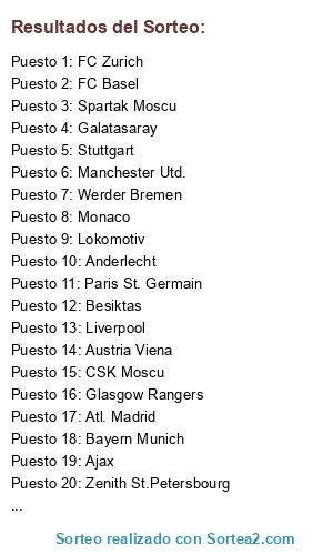 Lista de participantes: F Barcelona, Monaco, Paris St. Germain, Toulouse, Ajax, FC Twente, Feyernoord, PSV Eindhoven, AZ Alkmaar, Chelsea, Manchester Utd., Real Madrid, Liverpool, Arsenal, Tottenham, Milan, Inter de Milan, Juventus, Lazio, Roma, Fiorentina, SC Braga, Valencia, Rosenborg, Legia Varsovia, Oporto, Bohemians, Slavia Praga, AEK Atenas, Olympiakos, CSK Moscu, Rubi Kazan, Zenith St.Petersbourg, Atl. Madrid, Lokomotiv, Helsinborg IF, FC Basel, FC Zurich, Besiktas, Fenerbahce, Galatasaray, Bayern Munich, Borussia Dortmund, Schalke 04, Sevilla, Stuttgart, Trabzonspor, Werder Bremen, Rapid Viena, Austria Viena, Anderlecht, Club Brujas, Brondby IF, Celtic Glasgow, Glasgow Rangers, Villarreal, FC Kobenhavn, Spartak Moscu, Bayern Leverkusen, Sporting Lisboa, Manchester City, Girondins Burdeos, O. Lyon, O. Marsella.