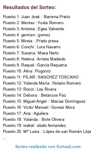 Lista de participantes: Enmanuel Jose Agrelo de la Vega, Mentxu Yusta Romero, Sandra Maroto, cristina garcia cambero, Ana Rojo, María Dolores Belmonte Frutos, Yolanda Bote Olivera, Elena Agudo Resino, Carmen Delia Rguez Socorro, barbara pulgar, diego hernandez, Jose Antonio Zacarias Bastida, Mireia Prieto presa, Antonia Egea Valverde, Laura gocentaite, Conchi Lora Navarro, yasmina gregori moncho, Veronica Martin, Catibel Fuentes Dura, jose antonio tello conejero, Juan José Barrena Prieto, JUAN LUIS BLANCO CASTILLA, Andrés Ruiz, CARLOS DIAZ DEL CAMPO LOZANO, Helena Arrieta Madiedo, Mari rojo, Rocio Ley Rivera, Eva Gómez González, María Luisa Pereira mordillo, Cristina M Fernández Expósitos, Noelia Carus Suarez, Isabel Burgos Cerezo, Melody Corral robles, Cristina Miret, Mª Isabel Morales Ortiz, Susana Cea Mirazo, Manuel Jiménez Pedrera, Encarna Maria Moreno Moreno, Mª Jesus Moreno Moreno, Daniel Lobaton Alba, Maria Angeles Borgoñon Gomera, María Falero Bernal, Marivi Pallares castillo, ESTHER MORAN PERIS, Esther Guisado Barrera, Mª Luisa López de san Román López, EVA ENRIQUEZ DIAZ, Carmen Molina Soto, Jessica Maria Sanchez Malvarez, Tamara Muñoz, Ana Aguilera, Nicolás María Albalá Molina, Isabel Velasquez Belleza, Juan Ramón Bayona Benjumea, Raquel García Requena, LAURA CARMEN RODRÍGUEZ MOLINA, Sandra Herrera Morilla, Ana Sereno Garzón, Jorge Caparrós Salmerón, Raquel Alfaro huerta, Noelia Rasgado, JESUS PEREZ PIQUERES, Alina Pogonici, ANTONIO LOPEZ MOLINA, PILAR SANCHEZ TOSCANO, tamara pena, Jose manuel Blanco Martinez, rakel carballeira diaz, Eva Patricia Bolaños Domínguez, Montse huerta rubio, isabel abalo fernandez, moises porto gosenge, Carmen Castelló Diaz, Maria Cecilia Rodríguez González, cristina garcía diez, Carolina Lucía izquierdo, Debora Betanzos Paz, Susana Masa Nieto, Beatriz Marcos, Patricia Cañas, conchi jaime nuñez, JOSE GRELA RAMOS, Miguel Angel GONZALEZ Rodriguez, tatiana martin garcia, BENJAMIN PEREZ LOPEZ, MIGUEL PEREZ MARTIN, Maria Belen Arroyo Roldan, Vanderleia Souza, Maria Gonzalez, Rafael Rodríguez Molina, Anabel Esteban Marchal, german gomez, Estrella López Camino, Gema Vega Gómez, Maria Elena Romero Garcia, Miguel Angel Macias Domínguez, Josylane Ramos Alves, Elena Anton Soria, Magdalena Caballero ruiz, Mónica Martínez cardador, eva vazquez rivas, Ana maria Porrero ruiz, Angélica carrero, Ana Martín Garcia, Samuel Ibáñez Rojas, Mª Villadiego Cruz Fernandez, Victor Manuel Gomez Mora, Yolanda María Notario Romero, Antonio Francisco Fernández Barquilla.