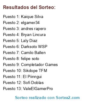 Lista de participantes: Completador Games, Sofi Doblas, Sikdope TFM, andres rapero, Bryan Lincura, Laly Diaz, Darksoto WSP, ValeElGamerPro, Kaique Silva, Camilo Ballen, El Piinngui, felipe soto, elgamer34.