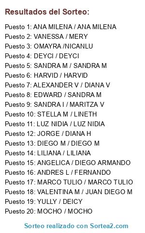 Lista de participantes: ALEXANDER V / DIANA V, SANDRA I / MARITZA V, STELLA M / LINETH, OMAYRA /NICANLU, ANDRES L / FERNANDO, EDWARD / SANDRA M, SANDRA M / SANDRA M, VANESSA / MERY, VALENTINA M / JUAN DIEGO M, JORGE / DIANA H, MARCO TULIO / MARCO TULIO, LILIANA / LILIANA, ANGELICA / DIEGO ARMANDO, YULLY / DEICY, DEYCI / DEYCI, LUZ NIDIA / LUZ NIDIA, DIEGO M / DIEGO M, MOCHO / MOCHO, ANA MILENA / ANA MILENA, HARVID / HARVID.