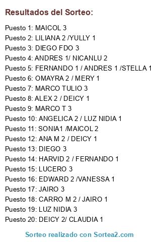 Lista de participantes: ALEX 2 / DEICY 1, ANA M 2 / DEICY 1, ANDRES 1/ NICANLU 2, ANGELICA 2 / LUZ NIDIA 1, CARRO M 2 / JAIRO 1, DEICY 2/ CLAUDIA 1, DIEGO 3, DIEGO FDO 3, EDWARD 2 /VANESSA 1, FERNANDO 1 / ANDRES 1 /STELLA 1, HARVID 2 / FERNANDO 1, JAIRO 3, LILIANA 2 /YULLY 1, LUCERO 3, LUZ NIDIA 3, MAICOL 3, MARCO T 3, MARCO TULIO 3, OMAYRA 2 / MERY 1, SONIA1 /MAICOL 2.