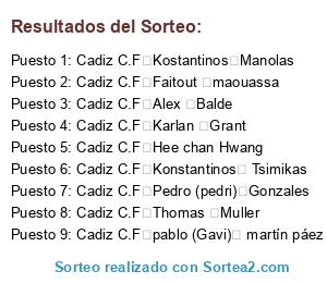 Lista de participantes: Cadiz C.F Keylor Navas, Cadiz C.F pablo (Gavi) martín páez gavira, Cadiz C.F Matheus cunha, Cadiz C.F Alejandro Gómez, Cadiz C.F Pedro (pedri) Gonzales, Cadiz C.F Pierluigi Gollini, Cadiz C.F Clinton Mata, Cadiz C.F Bouna Sarr, Cadiz C.F Lucas Moura, Cadiz C.F Kostantinos Manolas, Cadiz C.F RIDLE BOTE BAKU, Cadiz C.F Jose Luis Morales, Cadiz C.F Hee chan Hwang, Cadiz C.F Konstantinos Tsimikas, Cadiz C.F JOSKO GVARDIOL, Cadiz C.F Alex Balde, Cadiz C.F Thomas Muller, Cadiz C.F Joaquin correa, Cadiz C.F Thierry Correira, Cadiz C.F Nicolas Domingues.