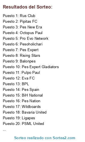 Lista de participantes: Pipitas FC, Pesoholichari, Ligapes, S-Lions, Wildboards, Croatia National, CaelumPes, PSML United, All-Stars Pes, Pes Nation, Rising Stars, Octopus Paul, Bavaria United, Pes Expert, Pes New Era, Rabid Wasps, Pes Eleven, Pes Selection, BPL, Pulpo Paul, Pro Evo Network, Rus Club, Pes Spain, Pes Expert Gladiators, Eva FC, BiH National, Gossip, Balonpes, Entregadosalpes, Pes Dragons.