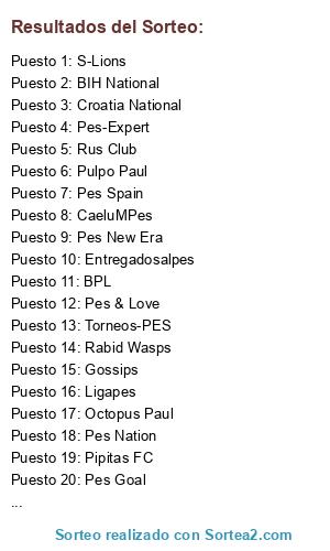 Lista de participantes: Balonpes, BIH National, BPL, CaeluMPes, Croatia National, Entregadosalpes, EVA FC, Gossips, LG Pes Eleven, Ligapes, Octopus Paul, Pes & Love, Pes Dragons, Pes Goal, Pes Nation, Pes New Era, Pes Serbia, Pes Spain, Pes-Expert Gladiators, Pes-Expert, PesSelection, Pipitas FC, Pro Evo Network, Pulpo Paul, Rabid Wasps, Rising Star, Rus Club, S-Lions, Torneos-PES, Wildboards.