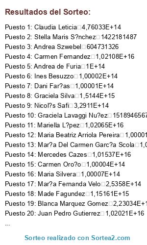 Lista de participantes: ?ngela Radulovich Britos 1,68755E+15, Ade Ifran 1179445784, Adelina Elizabeth Pi?eiro Pias 1,02049E+16, Adri Deferrari 1,00008E+14, Adri Gasquez 1,00003E+14, Adrian Day 1,80447E+15, Adrian Lopez 1,82422E+15, Adrian Sosa 4,09904E+14, Adriana Acu?a 6,08263E+14, Adriana Addesso 1,00001E+14, Adriana Busiello C?ceres 1,01539E+16, Adriana Castro Maldonado 1,00001E+14, Adriana Fernandez 1,02052E+16, Adriana Garcia Papaleo 1427813074, Adriana Gonzalez 1,35545E+15, Adriana Hernandez 6,43454E+14, Adriana Loreley Garcia Manfredi 1,00005E+14, Adriana Luna 1,00004E+14, Adriana Mendiberry 1,14671E+15, Adriana Ortelli 1E+14, Adriana Paz 1,19845E+15, Adriana Rodr?guez 1,00002E+14, Adriana Scialoia Retta 1,00001E+14, Adriana Silva 1,02081E+16, Adriana Silva P?rez 1,00001E+14, , Adriana Taladriz 1E+14, Adriana Wehking 1,02095E+16, Agus Pajares 1,12936E+15, Aguss Gonzalez 1,00001E+14, Agust?n Bello 1,81434E+15, Agustin Blanco Esteves 565338273, Agustin Gordano 1,71266E+15, Agustina Boffano Baccaro 677495002, Agustina Di Fortuna 630987921, Agustina Taroco 1,80183E+14, Ailyn Umpi?rrez 2,36996E+14, Alba Blanco 1E+14, Alba Graciela Farcilli Vila 1444170485, Aldo Pohlmann 3,4698E+14, Ale Murell 1,00006E+14, Ale Stephannie 1129771126, Alejandra Bauz? Colombo 8,39559E+14, Alejandra Bonelli 1,00002E+14, Alejandra Diazbar 1,00003E+14, Alejandra Gainza 1569229796, Alejandra Grzeszczyk 1,48143E+15, Alejandra Laboriti 1617416845, Alejandra Magallanes 1,00001E+14, Alejandra Obispo 2,97981E+14, Alejandra Otero 1,0203E+16, Alejandra Silva 6,29164E+14, Alejandra Texeira 8,47907E+14, Alejandra Villanueva Viera 1,00007E+14, Alejandra Yesabel Remersaro Peirot 9,78312E+14, Alejandro Murell 1,01529E+16, Alejandro Ramos 659665637, Alexandra Albin 1,00007E+14, Alexandra Bulla 1494374299, Alexandra Espiga 1110040177, Alexandra Etchebarne 9,11893E+14, Alexis L?pez 1,69076E+14, Ali Min 4,85382E+14, Alicia Alvarez 1,16404E+15, Alicia Comesa?a 1,56851E+15, Alicia Cristina Manta Berio 1,72361E+14, Alicia D?vila 2,73287E+14, Alicia De Lisa 1,06415E+15, Alicia Eme 1816984649, Alicia Faber Colo 1,60448E+15, Alicia Gravina 1,00003E+14, Alicia Katopulis 1,99031E+14, Alicia Lima 1,00007E+14, Alicia Minas Panos 1,00001E+14, Alicia Neves Carap? 1,01532E+16, Alicia Rosa 1,00001E+14, Alicia Siri Vieytes 1,00001E+14, Alicia Vaccaro 1,64955E+15, Alisson Emily Panuncio Martinez 1030161069, Alma Fuerte 5,04876E+14, Alma Pumar 1,59635E+14, Alvaro Picabea 1601301986, Alvaro Romero 1E+14, Amparo Santos Acosta 1,00001E+14, Ana Bestulfo 1,02084E+16, Ana Caravallo 569938800, Ana Claudia Gonzalez 1E+14, Ana Cristina Morales Moran 1E+14, Ana Cristina Mu?ozcastro 1,12103E+15, Ana Diaz 1,00001E+14, Ana Dieppa 1783734470, Ana Dos Santos 1,01544E+16, Ana Fernandez Lopez 1,00004E+14, Ana Garcia 2,02918E+15, Ana Gomez 1517501992, Ana Gutierrez 1463889512, Ana Karen Irisarri 1E+14, Ana Laura Cardoso Agis 1,0206E+16, Ana Laura Rodr?guez 1,81578E+15, Ana Laura Rodriguez 1,00002E+14, Ana Lopez 1,92305E+15, Ana Luisa Rios 9,42296E+14, Ana Maciel 2,19686E+14, Ana Maria Bidondo Artagaveytia 1E+14, Ana Maria Dotta Fernandez 1180730142, Ana Maria Giacaz Fernandez 2,12185E+14, Ana Maria Lema Mendez 1645416263, Ana Maria Romero Setelich 1,19132E+15, Ana Martinez 1,00002E+14, Ana Martinez Machin 1,02071E+16, Ana Piriz Ferreira 1313701982, Ana Ribeiro 1E+14, Ana Sobrino 1,02072E+16, Anabella Barrios 1,08572E+15, Anahi Alpuin 1679315081, Anahir Aznarez 1,4654E+15, Analia Correa 1,90634E+15, Analia Curbelo 8,79784E+14, Analia Peloni 1E+14, Analia Porras 1267158395, Anamaria Piattelli 9,48069E+14, Anddy Manya 3,75085E+14, Andr?s Gallo Vecino 6,48168E+14, Andrea Alcarraz 1,02065E+16, Andrea Batista 1,00001E+14, Andrea Castrillon 1,44101E+15, Andrea de Furia 1E+14, Andrea Elizabeth Calonge 1,6363E+14, Andrea Fern?ndez 1121234850, Andrea Gonzalvo Hoppe 1848326409, Andrea Iglesias 9,38162E+14, Andrea Ledesma Medina 1549736982, Andrea Lerena 7,55266E+14, Andrea Lopez 1,75641E+15, Andrea Maturro 8,40113E+14, Andrea Mendez 1,01545E+16, Andrea Patricia Rosado 1622354631, Andrea Perez 1,00005E+14, Andrea Romero 1,66241E+15, Andrea Ruiz Garcia 1,00001E+14, Andrea Ruy 1523250564, Andrea Santos 4,12664E+14, Andrea Szwebel 604731326, Andres Mir 1,67353E+14, Andres Pereyra 1,05787E+14, Andres Varela Acosta 1323424077, Angel Carpintero 1,08184E+14, Angela Gonzalez Paz 1,02047E+16, Angela Lupacchino 1409555655, Angela Ramona Bogliaccini Campo 1826119374, Angeles Patrone 1,00005E+14, Angelica Esteves 8,60361E+14, Angie Amy Armstrong Dauria 1082905731, Angie Perez 7,383E+14, Anita Bella Osta 1455860988, Anna Toya 1,00001E+14, Anselma Moreira Quinteros 1,18228E+15, Anto Buck 1,36381E+15, Anto Rodriguez 1,00005E+14, Anto Sosa 6,69643E+14, Antonella Cano 1,00007E+14, Antonella Larraz 1E+14, Antonella Lopez Valestrino 5,89275E+14, Antonella Moreno 1,02081E+16, Antonella Salvo 1,00002E+14, Antonia Perez 1,09241E+15, Araceli De La Encarnacion Perez 3,14519E+14, Araceli Demuro 1,2541E+15, Araceli Galarza 3,91712E+14, Araceli Krolak 1,00001E+14, Artista Adi Mani 1,71704E+15, Augusto B Zuccolini 1,00008E+14, Augusto Larrosa 1,00006E+14, Barbara Gabriela Barth 1E+14, Barbara Jara 1,47112E+14, Barrios Lourdes 1,00007E+14, Beatriz Braivante 2,29848E+14, Beatriz Dandaluz 1,00004E+14, Beatriz Grappiolo 1,00001E+14, Beatriz Karaian 1,00002E+14, Beatriz Puppo 7,50115E+14, Beatriz R?os 1E+14, Beatriz Velazco 1,00004E+14, Beel Martiinez 1,46855E+15, Bel?n Garc?a 1,01547E+16, Bel?n Pereira Peruggia 1,02076E+16, Bel?n Telles Cataldi 676300940, Belky Farolini 1336213579, Belta Blanche 1,00002E+14, Belu Pallares 8,39182E+14, Belu Pinion 1,02046E+16, Beto Recalde Rodriguez 1,94547E+14, Bettiana Stratta Panko 1629152292, Bettina Cob 1,00002E+14, Bettina Gallo Macedo 1,49594E+15, Bettina Lopez Nova 1,02102E+16, Betty Rene? Chavazco Negrin 1,00004E+14, Bety Perez Fajardo 1,02066E+16, Bianchi Andrea 1576779391, Bibiana Prigue 1,00001E+14, Blanca Casella 1388378050, Blanca Marquez Gomez 2,23034E+14,
