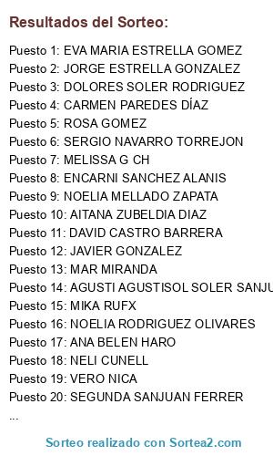 Lista de participantes: CONCEPCIÓN MATIAS SIMARRO, TONY TORRES, MONICA HERRERIAS, ALBERTO VIDAL TROITIÑO, ALICIA LATORRE, GLORIA IGLESIAS, CHESUS AR(12 participaciones), LETICIA PIRIZ MATEOS(2 participaciones), VANESSA VALLEJO(22 participaciones), SEGUNDA SANJUAN FERRER(5 participaciones), MARIA LUISA JARILLO GALINDO, ANA BELEN HARO(20 participaciones), ANGELA SARPENTE GARCIA, LUIGI CHAPORRO ROMERO, ESTER VM, FINA QUINTANAR MECO(2 participaciones), MARIA IRENE HERVAS FERRER(3 participaciones), SERGIO NAVARRO TORREJON, PATRICIA BENEITE, ROSA FERRER BRIA(4 participaciones), YESSICA DEL AMO SANCHEZ, JOSE LUIS ECHEVERRIA GALLO, ANA MARIA GONZALEZ CORTES, EDUARDO GONZALEZ CORTES, JONATHAN ECHEVERRIA, AGUSTI AGUSTISOL SOLER SANJUAN(4 participaciones), AROA ECHEVARRIA PEREZ, ANA MARIA LOPEZ MARTINEZ(5 participaciones), ELO MINGUEZ(2 participaciones), MARI ALONSO FERNANDEZ, NORII FRANCISCO, EVA TRUJILLO(6 participaciones), MIGUEL ÁNGEL, MARIA MARTIN PEREZ(2 participaciones), VANESSA MUÑIZ ALVAREZ(3 participaciones), SANDRA GALLEGO LOPEZ, VERONICA MESAS PASCUAL(5 participaciones), CRISTINA ESCRIBANO GUTIERREZ(2 participaciones), JOSE SANCHEZ(2 participaciones), ESTHER SANCHEZ(2 participaciones), BEATRIZ JULVEZ GONZALEZ, MARIA JOSE ESTRELLA M(9 participaciones), INMA PEREZ PASTOR(8 participaciones), SANDRA FERRÉ(10 participaciones), INMA PEREZ(4 participaciones), EVA PUELLES MESAS, AMAIA DE LA FUENTE, SARAH GARCIA(3 participaciones), MARIA CRUZ REAL VENTOSA, GLORIA A. GARCIA(4 participaciones), AURORA CUESTA VALLE(3 participaciones), BLANCA BERNABE GARCIA, VERONICA SUMILLERA(6 participaciones), PILAR MENDEZ(4 participaciones), MAY GAMUNDI(2 participaciones), DOLORES SOLER RODRIGUEZ(8 participaciones), VERO NICA(3 participaciones), CARLANGAS LANGAS GANGAS(12 participaciones), NOEL FERNÁNDEZ, ALEJANDRO SAMUELLE SILVEIRA(7 participaciones), ÓSCAR JESÚS(3 participaciones), MARIA FER MORA, MARIA ILUMINADA MARTINEZ GARCIA(2 participaciones), ESTHER MUÑOZ MARTÍN, PEDRO GARCIA SUAREZ, EMILIO ÁLVAREZ RODRÍGUEZ(3 participaciones), ROBERTO VAZQUEZ(9 participaciones), PEPI PAVAROTI(6 participaciones), MIKA RUFX(35 participaciones), MI MASAJISTA(10 participaciones), INCORPORE(10 participaciones), ZULEMA PONTES VIDAL(5 participaciones), YOLANDA DIAZ JIMENEZ(4 participaciones), REYES QUIFE, ANA SIERRA, LUCAS PERREZ HERREO, ROCÍO DÍAZ JIMÉNEZ, JOSE M. DOMINGUEZ, JESUS GARCIA(2 participaciones), DAVID CASTRO BARRERA, AITANA ZUBELDIA DÍAZ(2 participaciones), VERONICA FRUTOS DA SILVA(6 participaciones), FABRICIANO PEREZ, ROBERTO CEBREIRO, ANA MARIA PEREZ CAMAS(3 participaciones), JOSEP MARTIN, ESTRELLA SIERRA(3 participaciones), CHELO MOA(2 participaciones), JUAN GUILLEN(3 participaciones), JOSEFA SANCHEZ, QUINA APARICIO RIVERO(2 participaciones), SUSANA RAMOS DEL ALAMO(2 participaciones), ANA HERRERA PLAZA(2 participaciones), SONIA FLORIDO JIMENEZ(2 participaciones), IDAIRA HERNANDEZ(2 participaciones), JUAN RUBIO(3 participaciones), SANDRA RUBIO(2 participaciones), ROSALIA DIEZ, ROSALIA SANTOS, PABLO RUBIO PRESTEL, YOLANDA GUTIERREZ GOMEZ(3 participaciones), PASCUAL ALONSO(3 participaciones), LETICIA DOMINGUEZ, CARMEN ZAPICO ZAPICO, ESTHER BORRAS, NURIA GENE(3 participaciones), CARMEN LÓPEZ MATEO(2 participaciones), LAURA BARROSO ALVAREZ(2 participaciones), PATRICIA PONCE(4 participaciones), ABIGAIL LÓPEZ(2 participaciones), MANUEL ANDRADE, BENIGNA TASENDE, MARIA PEREZ(2 participaciones), PAKY MOLINA MESA, PEDRO ROSADO, AINOHA PATRICIA JÚAREZ(2 participaciones), MARIA MELINDRES(3 participaciones), PEQUEÑA ROSA, FANY DI NATALE, M PAZ MURCIA MERINO, AYNA TROTAMUNDOS, MARIA JESUS RAMOS(3 participaciones), GLORIA CASTELLANOS SANTOS, ONITA MUTHI(3 participaciones), BETY DAGHLAYAN(2 participaciones), ALBA MARIA GONZALEZ MUÑOZ, ROSER TRESSOR PIQUER, MARIA RUBIA RUBIA(2 participaciones), FLOR PONGO, CAROLINA VELAZQUEZ COBO, IRATXE ALBERDI MESAS, ARANTXA SANCHEZ, ANTONIA LEO MUNOZ(7 participaciones), MERCHE FÉLIX(5 participaciones), JOSE LOPEZ(6 participaciones), NIEVES ARRANZ ESCOBAR(2 participaciones), ENCARNACION GULLON ARIAS, IMMA LE, CIPRIANO MORENO APARICIO(2 participaciones), ISABEL DE LAS HERAS, MÓNICA HERRERÍAS(8 participaciones), MARTA ARREGUI(3 participaciones), ANDREA LAJO(25 participaciones), ZILIA MONTOYA, JUAN CARLOS RUBIO PRESTEL(2 participaciones), ROCIO SANCHEZ COLMENERO(2 participaciones), EMMA ARGUIZ, RAQUEL CANO(3 participaciones), JOSEFA CRIADO AZOR, AMPARO VALLS CLOFENT, LOREN CANO SOLER(6 participaciones), JOSE JAVIER NIETO(6 participaciones), VANESSA ZAMORA CORTÉS(2 participaciones), MIGUEL VARGAS ACEÑA(2 participaciones), YAIZA VEGAS(2 participaciones), ALBERTO MARTINEZ(2 participaciones), CRISTINA ORTOLLA TELLO(2 participaciones), VERÓNICA GONZÁLEZ, ARSENIO GALAN RAMIREZ(3 participaciones), NOEMI TELLEZ(2 participaciones), LORENA GUITIERREZ LOPEZ, MARIA ANGELES DIAZ PEINADO, VALENTINA DOBRE, JUAN CARBALLAL, ÓSCAR JESUS, MIREN K HERNANDEZ(2 participaciones), ANER UBILLOS, MARÍA MARÍA B, NORITA MORANDO(2 participaciones), MARIA DOLORES SANCHEZ TOME, COVADONGA REVERTE(4 participaciones), LIZ MEDINA(2 participaciones), RUTH SANJUAN(3 participaciones), MAY LOPEZ, CRUZ NIETO, NATALIA CUELLO, UBILLOS PEPELU(2 participaciones), LAURA EZQUERRA, ANTONIO MORENO, CARMEN PAREDES DÍAZ(2 participaciones), JOSE JIMENO, CHARI PEREZ, ELENA CUESTA GOMEZ, ANGELES DOMINGUEZ SIMON(2 participaciones), CRISTINA NAVARRO CABALLERO, MC ALVAREZ, ISA AMADO, JOSE ANTONIO HERRERO ENCINAS, JOSE ANTONIO GRIÑAN RODRIGUEZ, MARTINA SANTOS(3 participaciones), VERO ALONSO(2 participaciones), EVA MARIA ESTRELLA GOMEZ, BEA GARCIA, NATALIA JIMENEZ MENDEZ, NOELIA CARÚS SUÁREZ, SITO GUFER(4 participaciones), MAMEN GASCON, CATERINA MURIEL PADILLA, MILA CL, NOELIA RODRIGUEZ OLIVARES, JOSE M. REVERTE(2 participaciones), JOSE MIGUEL ILLAN ROCA, MARI CARMEN FERNANDEZ LOPEZ, JOSÉ ANTONIO GRIÑAN LOPEZ, DEA VOLARIC, BELEN PARRA BARRANQUERO(2 participaciones), JOSE ANTONIO HERMIDA CASTRO(2 participaciones), MAR