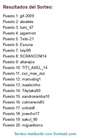 Lista de participantes: jagarmon, TITI_AXEL_14, aloalete, Txito-21, luiyi99, orduts8, miguelitomo, zxz_max_zxz, Escuna, sandrosamba10, jpf-2009, SCRANCOM14, lumi_47, isaakcinho, colmenero85, sakul_90, mariusbig1, Tikytaka90, altarejos, josecho17.