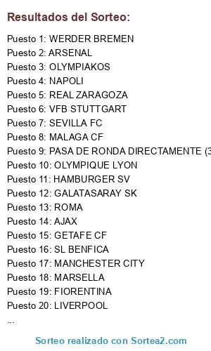 Lista de participantes: AJAX, A. VILLA, AC MILAN, ATLETICO MADRID, FC BARCELONA, GETAFE CF, LIVERPOOL, MANCHESTER CITY, MANCHESTER UTD., MARSELLA, NEWCASTLE UTD, RAYO VALLECANO, RCD ESPANYOL, REAL MADRID, ROMA, SPORTING CP, T. HOTSPUR, VFB STUTTGART, VFL WOLFSBURG, VILLARREAL CF, ARSENAL, ATHLETIC BILBAO, BAYERN MUNCHEN, CA OSASUNA, CHELSEA, EVERTON, FC OPORTO, FIORENTINA, GALATASARAY SK, HAMBURGER SV, I. PORTO ALEGRE, MALAGA CF, NAPOLI, PANATHIN., PSV, REAL BETIS, REAL ZARAGOZA, SCHALKE 04, UD LAS PALMAS, UDINESE, B. LEVERKUSEN, BOCA JUNIORS, BOR. DORTMUND, BORDEAUX, CD TENERIFE, GENOA, INTER, JUVENTUS, LAZIO, OLYMPIAKOS, OLYMPIQUE LYON, PARIS SG, RC DEPORTIVO, REAL SPORTING, SAMPDORIA, SEVILLA FC, SL BENFICA, SUNDERLAND, VALENCIA CF, WERDER BREMEN, PASA DE RONDA DIRECTAMENTE (1), PASA DE RONDA DIRECTAMENTE (2), PASA DE RONDA DIRECTAMENTE (3), PASA DE RONDA DIRECTAMENTE (4).