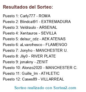 Lista de participantes: Cases89 - VILLARREAL, Guille_lm - ATHLETIC, jonakny - ZENIT, aLvarofresco - FLAMENGO, Veldraulo - ARSENAL, Carly777 - ROMA, Jliy0 - RIVER PLATE, Jonyho - MANCHESTER U., Xentauros - SEVILLA, Alonzo2020 - MANCHESTER C., Blindcat91 - EXTREMADURA, delsur_cdz - AEK ATENAS.