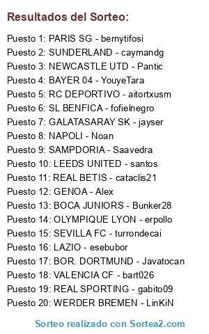 Lista de participantes: BAYER 04 - YouyeTara, BOCA JUNIORS - Bunker28, BOR. DORTMUND - Javatocan, LEEDS UNITED - santos, GALATASARAY SK - jayser, GENOA - Alex, LAZIO - esebubor, NAPOLI - Noan, NEWCASTLE UTD - Pantic, OLYMPIQUE LYON - erpollo, PARIS SG - bernytifosi, RC DEPORTIVO - aitortxusm, REAL BETIS - cataclis21, REAL SPORTING - gabito09, SAMPDORIA - Saavedra, SEVILLA FC - turrondecai, SL BENFICA - fofielnegro, SUNDERLAND - caymandg, VALENCIA CF - bart026, WERDER BREMEN - LinKiN.