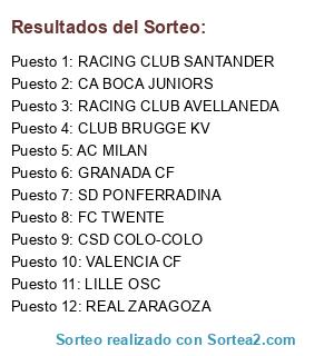 Lista de participantes: RACING CLUB AVELLANEDA, CSD COLO-COLO, GRANADA CF, FC TWENTE, CLUB BRUGGE KV, VALENCIA CF, SD PONFERRADINA, LILLE OSC, CA BOCA JUNIORS, RACING CLUB SANTANDER, AC MILAN, REAL ZARAGOZA.