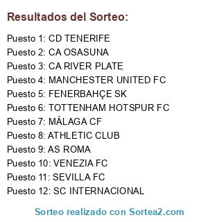 Lista de participantes: TOTTENHAM HOTSPUR FC, CD TENERIFE, CA OSASUNA, VENEZIA FC, FENERBAHÇE SK, SC INTERNACIONAL, SEVILLA FC, MÁLAGA CF, CA RIVER PLATE, AS ROMA, ATHLETIC CLUB, MANCHESTER UNITED FC.