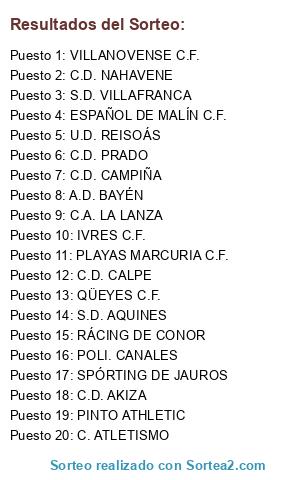 Lista de participantes: A.D. BAYÉN, C. ATLETISMO, C.A. LA LANZA, C.D. AKIZA, C.D. CALPE, C.D. CAMPIÑA, C.D. NAHAVENE, C.D. PRADO, ESPAÑOL DE MALÍN C.F., IVRES C.F., PINTO ATHLETIC, PLAYAS MARCURIA C.F., POLI. CANALES, QÜEYES C.F., RÁCING DE CONOR, S.D. AQUINES, S.D. VILLAFRANCA, SPÓRTING DE JAUROS, U.D. REISOÁS, VILLANOVENSE C.F..