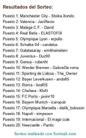 Lista de participantes: Bayer Leverkusen - ando85, Bayern Munich - icaropub, Chelsea - KloN, FC Porto - javinr10, Galatasaray - emiliheineken, Genoa - rubenhl, Internacional - El mago cule, Juventus - Duc90, Malaga C.F. - David, Manchester City - Stoika Xondo, Napoli - simpsoon, Newcastle - Pantic, Olympique Lyon - erpollo, Olympique Marsella - deilik_buksson, Real Betis - ELASTOFIX, Roma - IsraRS, Schalke 04 - candelus, Sporting de Lisboa - The_Owner, Valencia - JaviRecio, Werder Bremen - GaloreDe roma.