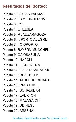 Lista de participantes: ARSENAL, ATHLETIC BILBAO, BAYERN MUNCHEN, CA OSASUNA, CHELSEA, EVERTON, FC OPORTO, FIORENTINA, GALATASARAY SK, HAMBURGER SV, I. PORTO ALEGRE, MALAGA CF, NAPOLI, PANATHIN., PSV, REAL BETIS, REAL ZARAGOZA, SCHALKE 04, UD LAS PALMAS, UDINESE.
