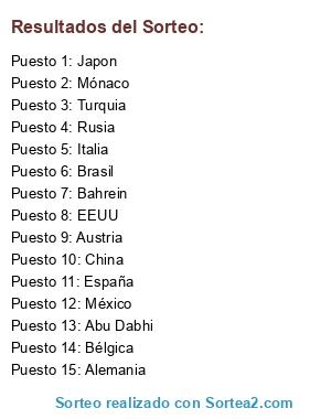 Lista de participantes: Abu Dabhi, México, Alemania, Rusia, Bahrein, Turquia, Mónaco, China, Japon, Italia, Bélgica, EEUU, Austria, España, Brasil.