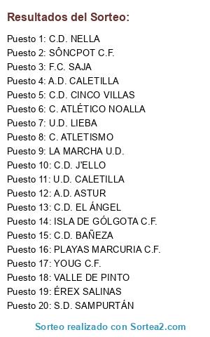 Lista de participantes: A.D. ASTUR, A.D. CALETILLA, C. ATLÉTICO NOALLA, C. ATLETISMO, C.D. BAÑEZA, C.D. CINCO VILLAS, C.D. EL ÁNGEL, C.D. J'ELLO, C.D. NELLA, ÉREX SALINAS, F.C. SAJA, ISLA DE GÓLGOTA C.F., LA MARCHA U.D., PLAYAS MARCURIA C.F., S.D. SAMPURTÁN, SÔNCPOT C.F., U.D. CALETILLA, U.D. LIEBA, VALLE DE PINTO, YOUG C.F..