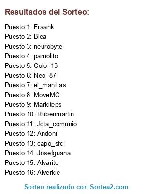 Lista de participantes: el_manillas, Alvarito, Markiteps, JoseIguana, Fraank, pamolito, Neo_87, Rubenmartin, capo_sfc, Jota_comunio, neurobyte, Colo_13, Andoni, Blea, Alverkie, MoveMC.