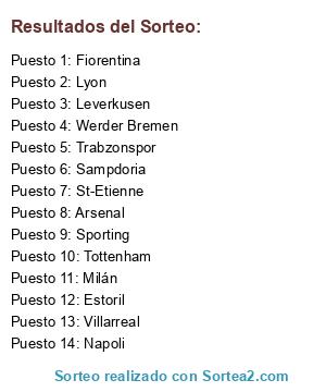 Lista de participantes: Villarreal, Lyon, Tottenham, Sampdoria, Estoril, St-Etienne, Napoli, Werder Bremen, Fiorentina, Trabzonspor, Milán, Leverkusen, Arsenal, Sporting.