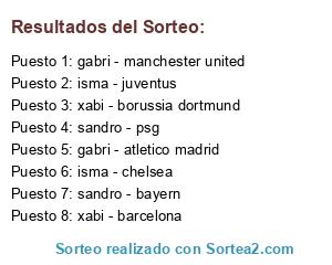 Lista de participantes: xabi - borussia dortmund, xabi - barcelona, gabri - atletico madrid, gabri - manchester united, isma - chelsea, isma - juventus, sandro - psg, sandro - bayern.