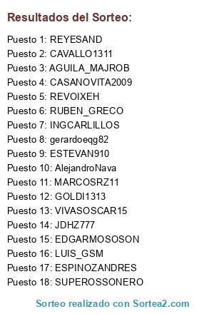 Lista de participantes: ESTEVAN910, GOLDI1313, AGUILA_MAJROB, VIVASOSCAR15, RUBEN_GRECO, INGCARLILLOS, CASANOVITA2009, REVOIXEH, EDGARMOSOSON, ESPINOZANDRES, REYESAND, JDHZ777, LUIS_GSM, MARCOSRZ11, AlejandroNava, gerardoeqg82, SUPEROSSONERO, CAVALLO1311.