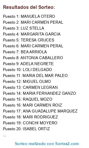 Lista de participantes: BEGOÑA LOPEZ(2 participaciones), BEA ARRIOLA(2 participaciones), CARMEN PLOU, LUZ STELLA, MAITE BEZANILLA, ANA AZNAR, ISABEL ORTIZ(2 participaciones), VIRGI BELVIS, MARIA ANTONIA OBREGON(2 participaciones), ANA GUADALUPE MARQUEZ, CONCHI MOYERO(2 participaciones), ISABEL GONZALEZ, MARGARITA GARCIA, MARIA FERNANDEZ GANZO(2 participaciones), MARY CUORE, LUIS SETIEN, LOLI DELGADO, CHANI MUÑOZ(2 participaciones), MARGA GOMEZ(2 participaciones), PILAR CAÑAS(2 participaciones), CARMEN HERNANDEZ, MONTSE AJA, MANUELA PULLIDO, TERESA CRUCES(2 participaciones), MARY FERNANDEZ(2 participaciones), PILAR MOLIAS, ROSA PIÑERO, CAROLINA RAMOS, MARTA BRAVO, LETICIA SANTAMARIA, RAQUEL MOZO, TRINI, GABRIELA TRISCA, MARIA DEL MAR PALEO, ALBERTO MANUEL MONTES, MANUELA OTERO, MARIA ELENA CASADO, PAQUI NODO, MERCEDES GOMEZ(2 participaciones), PEPY VAMAR, RUTH FLORENCIO, CRISTINA GONZALEZ, MIGUEL OLMO, ILUMINADA FERNANDEZ(2 participaciones), VICTORIA DE LA CRUZ, CARMEN LEGRAN, MARI RODRIGUEZ, SARO RODRIGUEZ(2 participaciones), MARAI DOLORES TORRES, MILAGROS GUTIERREZ, ADELA NEGRETE, ANTONIA CABALLERO, LIDIA MORO, MARI CARMEN ROIZ, MARI CARMEN PERAL(2 participaciones), PILAR CABANILLAS, ROSA BREZO.