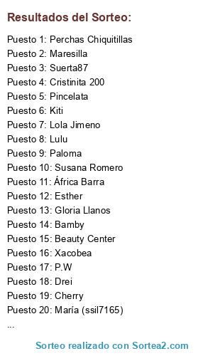 Lista de participantes: Drei, Paloma, Susana Romero, Gloria Llanos, África Barra, Toñi Buendía, Lola Jimeno, Marta Layna, Perchas Chiquitillas, Xacobea, Lulu, Maresilla, Cherry, Pincelata, Morla, Chaty, Finiasa, Bamby, Romantica, Suerta87, Esther, Kiti, P.W, Beauty Center, Chatungaaee, Conejuela 2, Cristinita 200, María (ssil7165).