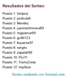 Lista de participantes: zapatah99, sergito, heyibiza, Pici11, Aquarius97, migsiemar99, jordicule5, Mendez, juanmartinrivera89, TramuCreta, tonijaca, guifiti123.