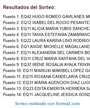 Lista de participantes: EQ1 NARCIZA INTRIAGO, EQ1 ANA DEL ROCIO MOLINA PENA, EQ1 SANDRA GUADALUPE GAETE LASCANO, EQ1 LEONOR MARIA DE JANON ESPANA, EQ1 FRANCISCA MANER, EQ1 MARJORIE CAROLINA BOHORQUEZ VASQUEZ, EQ12 LORGIA ENILDA VERA GUILLEN, EQ14 MARY ISABEL RONQUILLO RONQUILLO, EQ14 KATHERINE JUDITH SALAZAR VENTURA, EQ14 HUGO JOEL ZAMORA VENTURA, EQ14 ALEJANDRINA HERMINIA LETERNEUR ALAVA, EQ14 ROSA ELVIRA QUINTUNA BURI, EQ14 MARLENE JESUS PENA PINELA, EQ15 BLANCA CATALINA ESCALANTE ORTIZ, EQ15 MELVA JUDITH GALARZA RODRIGUEZ, EQ15 CRISTINA PAOLA HURTADO ESCOBAR, EQ15 ELISA FRANCISCA LESCANO TAPIA, EQ15 LEONILA CIRILA MARCILLO PILAY, EQ15 JACOBO BASILIO MENOSCAL MENOSCAL, EQ15 GABRIELA TAMARA MOSQUERA VILLACIS, EQ15 ISABEL CATALINA MURGUEITIO VELASTEGUI, EQ15 JACINTA ISABEL OCHOA JAME, EQ15 WILMINGTON CARLOS PINCAY JAMA, EQ20 MIGUEL ANGEL MOSQUERA JIMENEZ, EQ20 ERICK ENRIQUE MUNOZ ALVARADO, EQ20 CRISTINA ELIZABETH QUISAI BUSTAMANTE, EQ28 LORENA MARY REYES MOREIRA, EQ28 YENNY MARIA SAUHING LUA, EQ28 MAYRA ALEXANDRA YOZA MENDEZ, EQ23 RONALD GERARDO CHIQUITO TERAN, EQ23 EVA ANNABEL ORDONEZ CANAR, EQ23 UVEYALINA PEROZO, EQ23 MAGALY IVON VERAMENDI QUISPE, EQ29 SILVIA MONSERRATE GARCIA GOMEZ, EQ42 ADELA PIEDAD ALVARADO MACIAS, EQ42 ADIRA ARIANNA ARROYO CHARCOPA, EQ42 MERCEDES INDELIRA BRAVO CONFORME, EQ42 JULIA GRACIELA CASTRO LEON, EQ42 KARLA JULISSA CORTEZ LOPEZ, EQ42 MARIA ANGELICA CECILIA CUESTA UBILLA, EQ42 SARA MERCEDES FAJARDO URINA, EQ42 JESENIA ELIZABETH FRANCO, EQ42 HUGO ROMEO GAVILANES MENDEZ, EQ42 GENESIS INES GUERRA PACHECO, EQ42 LILIAN HERNANDEZ MERO, EQ42 ANA ELODIA HOLGUIN CACAO, EQ21 EDDY FERNANDO VELEZ VELEZ, EQ11 GLADYS ALVEAR, EQ11 MORAIMA EMPERATRIZ GRANDA ALVAREZ, EQ11 CHRISTIAN RENE VARGAS ALAVA, EQ11 MILADY JACQUELINE LAZO GUERRERO, EQ11 MARIUXI MARIBEL LOPEZ GARCIA, EQ11 ANA OLIMPIA ALVEAR MERIZALDE, EQ11 MARTHA LEONOR TORRES CHOEZ, EQ11 GRETA LEONOR TAY HING QUIJIJE, EQ1 CORINA VIVIANA TORRES GONZALEZ, EQ1 ARELYS AURA PIN SUAREZ, EQ1 ANDREA JACQUELINE PENA VINCES, EQ1 LUIS JOSE MERCHAN SANCHEZ, EQ1 ANGIE MICHELLE MAGALLANES VENTURA, EQ1 ROSALIA ALVARADO CORTEZ, EQ1 CARMEN ANA CEVALLOS VERA, EQ14 JORGE ANDRES AVILES ROSADO, EQ14 ILIANA JOSELYN LINO ORTIZ, EQ14 HUGO OSVALDO ZAMORA MOREIRA, EQ15 BLANCA MARIA MUNOZ MUNOZ, EQ18 ALEXANDRA MARIA PITA LEON, EQ18 LAURA MARIA SANCHEZ ANA, EQ18 DOLORES LANNY VILLAMAR LINO, EQ23 MARIA PATRICIA ABAD ORTIZ, EQ23 SOLANGE JAZMIN ALCIVAR MOREIRA, EQ23 ELSA PIEDAD ANCHUNDIA AVILA, EQ31 FLOR DEL ROCIO BARRAGAN MOLINA, EQ31 GAVINA BURGOS MORA, EQ31 ALBA JUSTINA CARRANZA MOLINA, EQ31 EUFEMIA DEL VALLE, EQ31 MARIA ACENCION DIAZ LUCIO, EQ31 SARA VICTORIA GARCES LOOR, EQ31 PAULA DANIELA JACHO TANDAZO, EQ31 JANINA JANETH OVIEDO GUARANDA, EQ31 ANGELA FANNY PEENA TIBANQUIZA, EQ31 JAIRO MARCELO PILAY SANCHEZ, EQ31 PEDRO JULIO ZAVALA ORDONEZ, EQ49 KATHERINE ISABEL BERMUDEZ RESABALA, EQ49 TRANSITO MARGARETH CAMACHO ANGULO, EQ49 ANA MARIA COXX MORA, EQ49 GINA ESTHER GONZALEZ SANTANA, EQ49 PATRICIA ISABELL JACOME BARRAGAN, EQ49 ARACELY MARTINA MONTECE ZAMORA, EQ11 MARIA MAGDALENA UTRERAS MOLINA, EQ11 ROCIO DEL PILAR SANCHEZ MORALES, EQ11 YULI IRALDA VELIZ CASTRO, EQ11 CRUZ MARIA SANTANA DEL VALLE, EQ14 ROSA CAROLINA RODRIGUEZ ZAMBRANO, EQ14 ENRIQUETA ROBERTINA CORONADO JIMENEZ, EQ14 CINTHIA ELIZABETH CRUZ SAMANIEGO, EQ14 DAISY DEL ROCIO GONZALEZ YAGUAL, EQ14 DIANA DENISSE MONTALVO BARRERA, EQ14 ANA MARIA PAZ SEGURA, EQ14 ILIANA NOEMI SALAZAR VENTURA, EQ14 MARIA VIOLETA RODRIGUEZ, EQ14 MARIA DE VILLACIS, EQ14 NORMA CECIBEL POTES LETURNE, EQ14 ESPERANZA PALADINES RAMOS, EQ14 MONICA DEL PILAR ZUNIGA SALAZAR, EQ14 GILDA AMADA MACIAS ESCALANTE, EQ14 MARIA DEL PILAR SALGADO CABEZAS, EQ15 FELISITA AMELIA ROSADO NAVARRETE, EQ15 LISSETTE STEPHANIA ROSALES MERO, EQ15 LILIANA RAMONA SALTOS PILLASAGUA, EQ15 VIVIANA LISSETTE TIGUA PEREZ, EQ15 MELANIE DENISSE TOBAR QUIMIS, EQ15 ANGELO JAHIR VILLAMAR MERCHAN, EQ15 ANDREA CRISTINA YEPEZ YEPEZ, EQ21 LUCIA EMPERATRIZ CASTRO BAJANA, EQ21 CATHERINE DEL CARMEN CEDENO RAMIREZ, EQ21 FLOR MARIA CHIPRE VILLAFUERTE, EQ21 ALICIA ORFELINA LEDESMA LEDESMA, EQ21 CATALINA STEFANNY ROMAN SALINAS, EQ29 ROBERT ENRIQUE BARCIA JARAMILLO, EQ29 MARTHA JULIA BUSTAMANTE ARAUJO, EQ29 MARIA ELENA CANTOS LAMILLA, EQ29 MYLENE ANTONELLA CARRILLO GAFTER, EQ29 ALEXANDRA ESPINOZA PALACIOS, EQ29 REGINA LEONES ZAMBRANO, EQ29 KANE STEVEN MACIAS CARRANZA, EQ37 IRENE ROSALIA AYALA TRIVINO, EQ37 DAYSI JANNINA BAZURTO RIVERA, EQ37 FABIAN ANDRES BERMUDEZ BARCIA, EQ42 ERLINDA DEL ROCIO MOREIRA MOREIRA, EQ42 NORY CAROLINA OLVERA HERRERA, EQ42 FRANCISCA ELENA ROSADO RIVERA, EQ42 JULIANA FARIDA SALTOS FUENTES, EQ42 LUISA ANTONIA SANCHEZ RIOS, EQ42 WALTER ENRIQUE SOTOMAYOR OROBIO, EQ42 ROXANA PILAR SUAREZ SANCHEZ, EQ42 VICTOR MANUEL TOMALA VERA, EQ42 ELENA RITA VILLAMAR CHELE, EQ42 ILIANA LUCIA VILLENA MERO, EQ11 VERONICA MERLY CEVALLOS PONCE, EQ11 JENNIFER ESTEFANIA CUELLAR CANGA, EQ11 CHRISTIAN ROLANDO CASTRO BAQUE, EQ11 LLAMEME VERONICA NIETO BARQUET, EQ14 DANNY MANUEL JIJON LEON, EQ14 DOMENICK FERNANDO ALAVA NAVARRETE, EQ14 KEVIN ADRIAN FLORES CONCHA, EQ14 LILIA MARGARITA SAQUISILLY GUARANDA, EQ14 VIVIANA MARISOL ANGAMARCA VARGAS, EQ14 CAROL MISHELLE ZUNA CORONADO, EQ21 SONIA ALEXANDRA SILVA MUNIZ, EQ21 MAYRA DEL ROCIO SIONG-TAY RIVERA, EQ21 MERCY VIOLETA SUAREZ BACILIO, EQ21 GABRIEL HUMBERTO VELEZ GRANADOS, EQ21 PATRICIA PILAR VENTURA PRECIADO, EQ22 SANTACRUZ ALBA, EQ29 RAMONA DEL CARMEN MONSERRATE MORAN, EQ29 BETTY NINABANDA, EQ29 AUSTRIDE ELAINA PENAFIEL AVILES, EQ29 ROSLIN ROCHELY PINARGOTE ZAMBRANO, EQ29 SILVIA FABIOLA ROSERO ROSERO, EQ29 MALINSE MERCEDES SANTANA LOOR, EQ29 MIRIAN EDITH SANTANA LOOR, EQ29 ELIZABETH JACQUELINE SANTOS YEPEZ, EQ29 MARIA CAROLINA TORRES RUILOVA, EQ29 LIGIA MARIANA VEINTIMILLA MOLINEROS, EQ29 ALLISSON TANIA VILLAMAR BAQUE, EQ29 JAZMIN MAGDALENA VILLAMAR BRIONES, EQ37 JORDANO DANIEL ESPINOZA QUINDE, EQ37 BEATRIZ MARIA JARAMILLO ROSADO, EQ37 NELLY CRISTINA MARISCAL BONILLA, EQ37 SILVIA MONSERRATE MINDIOLA BUENO, EQ37 NARCISA