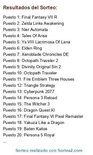 Lista de participantes: Baldurs Gate 3, Divinity Original Sin 2, Final Fantasy VII R, Elden Ring, Persona 5 Royal, The Witcher 3, Dragon Quest XI, Diablo 4, Zelda Tears Of The Kingdom, Yakuza Like a Dragon, Persona 3 Reload, Star Ocean The Second Story R, Tales Of Arise, Octopath Traveler, Octopath Traveler 2, 13 Sentinels Aegis Rim, Triangle Strategy, Fire Emblem Three Houses, Cyberpunk 2077, Lost Odyssey, Final Fantasy X, Final Fantasy XVI, Xenoblade Chronicles 3, Nier Automata, Tactics Ogre Reborn, Xenoblade Chronicles 2, Skyrim, Final Fantasy VI Pixel Remaster, Xenoblade Chronicles DE, Baten Kaitos, Ys VIII Lacrimosa Of Lana, Zelda Links Awakening.