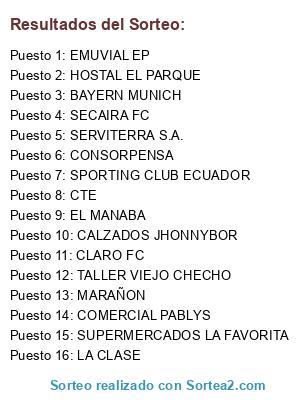 Lista de participantes: CLARO FC, EMUVIAL EP, HOSTAL EL PARQUE, CONSORPENSA, SECAIRA FC, SPORTING CLUB ECUADOR, CALZADOS JHONNYBOR, BAYERN MUNICH, CTE, MARAÑON, EL MANABA, COMERCIAL PABLYS, SUPERMERCADOS LA FAVORITA, TALLER VIEJO CHECHO, SERVITERRA S.A., LA CLASE.