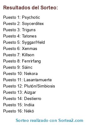 Lista de participantes: Aizgar, Destierro, Fenrirfang, Indiia, Killson, Lasantamuerte, Nekora, Plutón/Simbiosis, Psychotic, Soycerditex, Syggar/Held, Sáinc, Tatones, Triguns, Xenmas, Nëkö.
