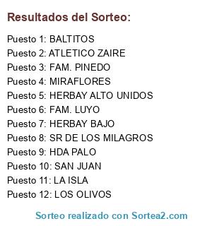 Lista de participantes: ATLETICO ZAIRE, LOS OLIVOS, MIRAFLORES, SR DE LOS MILAGROS, HERBAY ALTO UNIDOS, SAN JUAN, HDA PALO, LA ISLA, HERBAY BAJO, BALTITOS, FAM. PINEDO, FAM. LUYO.