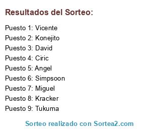 Lista de participantes: Kracker, Vicente, Ciric, Simpsoon, Tukuma, Konejito, Miguel, Angel, David.