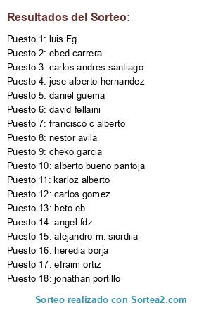 Lista de participantes: carlos andres santiago, cheko garcia, alberto bueno pantoja, ebed carrera, jose alberto hernandez, alejandro m. siordiia, francisco c alberto, angel fdz, nestor avila, luis Fg, carlos gomez, heredia borja, jonathan portillo, karloz alberto, beto eb, david fellaini, daniel guema, efraim ortiz.