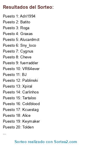 Lista de participantes: Alice, Cygnus, Sny_loco, Keymaker, fuerradder, Roga, Kcuestag, Carlinhos, Cheve, Adri1994, Tartaloo, Coldblood, VR64ever, Xpiral, Alucardmct, Tolden, Pablinski, Batito, BJ, Graxas, GRS.