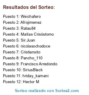 Lista de participantes: Francisco Arredondo, Ratau84, Hector M, Afrojimenez, hriday_karnani, Cristianxito, SiriusBlack, nicolasochodoce, Weichafero, Matías Crisóstomo, Pancho_110, Sir.Juan.