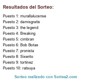 Lista de participantes: Bob Botas, Breaking, cimbran, damisgratis, murallalucense, pronista, ratsuya, Sixerito, the legend, tortinez.