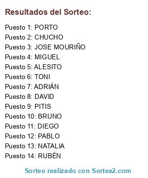Lista de participantes: JOSE MOURIÑO, PORTO, ADRIÁN, RUBÉN, PABLO, TONI, DAVID, NATALIA, CHUCHO, BRUNO, DIEGO, MIGUEL, ALESITO, PITIS.
