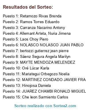 Lista de participantes: PENAGOS GALLART THALIA, Liang Liu, CASTILLO RODAS, SOFIA DE MILAGROS, Sandoval Moreno, Francesca Stephany, PADILLA ORTEGA LUIS FREDDY, Ruiz Echeandía Diego, Raunelli Montero, José Carlos, Alcántara Benavides Pedro Martin, Málaga Mellado Alexandra Ninoska, TARAZONA RITA, Yupanqui Ruiz Sheyla Silvana, Umeres Gianfranco, manuel seminario, Ospino Ibarra David, Castro Molina Rolando, Culque Chuquipa David, Chuquilín Mori, MARTÍNEZ GOYONECHE, PIERO, BLANCO RAMOS CHRISTOPHER, López Chong Juan, Ramal Monica, Villegas Marcelo, Yauri Grados Kathya, MORENO JURO DAYANN LIZBHET, Olivero Sanchez Luis, GIRALDO BENITES MIGUEL, Joe Yañez Gentille, LEON CADILLO MARIA LUCIA, SALAZAR SOSAYA MIGUEL ALBERTO, tupac ascarza chris stefany, Che leon Sarmiento Carlos, KOC ENCINAS JORGE, Tong Tam Brian, Reinoso Trabucco, Angela Carolina, Mendoza Samaniego Lilia, Requejo Zapata Fernando, Alania Gerónimo Angela Milagros, Castro Tavera Madelaine, Calvo Mac Daniel, CIEZA SANEZ EDUARDO JEANPIEARE, FERNANDINI MENDEZ DANIEL, Lozada Velasco Gabriel, Díaz Ramos, Johanna Paola, Gonzales Benites Martin Gustavo, Saavedra Pinedo Alexander, CARBONE CARRASCO JOHN, Quevedo Chávez Mariella Alejandra, Gustavo Cruz Ampuero, Aguilar Garrido Guillermo Armando, Samanez Arroyo Daniela Alejandra, VILCA jovanna, Vásquez Montero Milton Junior, VARGAS RAMIREZ ALEXANDRA YAMILET, Sanchez Rubio Carlos Javier, Barrientos Del Alamo Valentín, VILLANUEVA RICALDE FERNANDO, Lozada Machado Stephanie, SALAZAR PACHECO JUAN, Mayra Soto Neyra, Penny de Armero, Ian, Chavez Tabatta, Castillo Yllanes Yeri, Calderon Ugaz Gianet R., Pinto Hernandez Anyela, Espinoza Canales, Alfredo, ROSALES MINAYA RENZO LUCIANO, simon samaan milagros joana, Fernández Tuesta Geziel, Peña Gutierrez Fabiola, CHIOTTI ARROE JOHANA, SIERRALTA SILVA, CASTILLO LISSON JOSE ANTONIO, harold saavedra ortiz, Arias Meneses Andrea, arana maestri, Chirinos Bustillos Julio, Huerta Aucasime Juan Armando, Ludeña Ramos, Percy Miguel, DE LA RIVA CACHAY, Rodolfo Alejandro, Samame orellano carlo mario, TATAJE MONTERO CLAUDIA, Rojas Vásquez Laura, Bencan Cordero, Chiarella, TORRES LAVERIANO, Colquepisco Toledo, Luis Javier, Serpa Ponce Manuel, López Hidalgo Miguel, Daysi Vargas, Villajulca Vela Francisco, Canales Saldaña Misael Antonio, ASALDE LEÓN, JOSÉ MARIANO, VALERA TOLEDO JANETT DEL PILAR, CUNEO ASENCIOS JOSE, LUCAS VELARDE ELIZABETH, Almerco Porras Falon Pamela, Herbozo Dora, Sotomayor Villacorta, Gracia, PAMELA PERLA AFA, Cobian Fernando, Oliva CHinchayan Daniel, TERRONES HUAMAN ROBERT ANDERSON, moreno diaz angelo, San Miguel Zapata, Estefania, Cáceres Chumpitazi Andrea, GUTIERREZ PÉREZ, MARTINEZ TORRES CARLOS, Marin Huaycama Jose Luis, Sanchez Guevara Diego, DIAZ MILLA ALBERTO, alvarado escobar karen milagros, VIAÑA DIAZ DEL OLMO, BRANCA LUCIANA, Chávez Pierina, Jochamowitz Cárdenas, Mariana, Recuenco Patiño Sandra Milagros, Canelo Solórzano César Aldo, PAJARES STANBURY JAVIER, Ugarte Diaz Alejandro, León Machacuay César, Muñoz Alzamora, Joseph, ramírez estrella andrea, ASTO ASPARRIN SAMUEL RICARDO, FALCÓN CABRERA, JOSÉ BERNABÉ, Bendezu Garcia Laurita, SALAZAR PRADO TALIA MILAGROS, BOGGIANO DIEZ-CANSECO RENZO, QUIROZ TORRES ESTEFANIA, Guinoza Noguni Andres Antonio, Sedano Vera Paul Angel, Vilchez Moreno Jean Pierre, Micaela Silva, schroth pinilos alessandra, FLORES APARICIO CAROLINA, ROCA REY PAULA, Jorge Luis Manrique Valverde, FUENTES GABRIEL EDDER, Pacheco Chavez Jeam Jeffrey, Retamozo Rivas Brenda, pais bozzo luis angel, PACHECO CLAUDIA, Seminario Garcia Liliana Helena, Muñoz Delgado Gabriel, ORTIZ ARGUMEDO MANUEL ALEJANDRO, HUASANGA RAMIREZ, MARIEL, Conde Yauri Jorge Eduardo, mendoza carbajal luis, Ugaz Pujada Carla Cristina, Villegas Nicoletti Franco, Cabrera Pacheco Renzo Enrique, BALMELLI PARRAGA HECTOR JESUS, CARRANZA SALCEDO BRENDA, Cavalié Orihuela Fernando, Carla Inés García García, Sánchez Leveau Verónica Amapola, MOSCOSO ARCE XIMENA, Hermoza Palomino Roberto, Bernos Ampuero Joao, Sanz Di Tolla, Orihuela Rojas, Marcelo, Aguinaga, Kalina, Neira Quispe Julio Martin, Bilbao Yacila, Oscar Carlos, Carrasco Dueñas Andrés, Acula Navarro, Dick, Loayza Rafael, ALCALA RAMOS SAMMY, Signori Gorriti Ian, RAFAEL BLAS, JOSEPH, Raquel Alegría Reymer, Céspedes Dávalos, María del Pilar, PRETELL KISHIMOTO LESLIE HANAE, QUEQUESANA SOLSOL JOSE LUIS, BARBOZA CARNERO XIMENA, cam ore guisell, Tenorio Villegas Grace, Lujan Berger Samuel, ROSALES PEREZ RAY, MUÑIZ MARQUEZ RENZO, CHACA PRADO BORIS, Rojas Romero Ema, PALACIOS URQUIZA ANTONIO, Cardenas Velasque Diego, Pezo Cárdenas Willy Francis, Romero Sandra, Egoávil Espinoza Susana Edith, Matos Pachas Mónica, Alegría Vivanco Pammela Lissette, CIEZA CORONADO, sonia corina janampa luna, Espezua Victoria, HERENCIA PEÑA JOAO, Mondoñedo Castillo, Jaime Rodrigo, HUGO GUARDIA, CHRISTIAN FRANCISCO, loli diaz marco, Zegarra Lopez Jose Antonio, Giulio Giuffra, segura palomares jesus, celi guzman mario paolo, Laos Choy Piero, MANTILLA ACOSTA CARLA ELIZABETTH, Ormea Sánchez Mayra Denisse, Mori Inga Eimy, Velásquez Peláez, Renato, FARFAN KARLA, Borda Díaz Natalia, CALDERON CASTILLO CESAR ANDRE, Cornejo Lopez Jesus Renato, Guillén Castro, Janette, Yauri Guadalupe José, Renzo Madueño Carcelén, aliaga miranda, andrea, BENITES DÍAZ, MOISÉS, Alarcón Olave Carmen, Paredes Luis, Gutierrez Vega Eduardo, HERAN SALAZAR, IVETTE, Herrera Fowks Renzo, Avellaneda Pajares, Gema, Marroquin Gamara Gabriel, Arrasco Trelles Jorge, BERMUDEZ URIOL SARA, Peña Bieberach Daniel Gonzalo, Peña Narváez Greta Cecilia, Ortiz Encalada, Rafael, vasquez rivera katya, Macassi Quispe Jesús Humberto, Martos Vasquez Irán, Mori Matienzo Sandra, Javier Cortez Julio Ernesto, Lastretto Granda Fiorella Alexandra, CANTUARIAS RAFAEL, WONG PAMELA, Cueva Murillo Fatima, Zárate Chávez Vanessa, Okawa Chiu Jorge, barandiaran rincon cynthia angela, LAURA NAMUCHE GIGI, Mariategui Orbegozo Noelia, LEON BOBADILLA JESUS, VIL