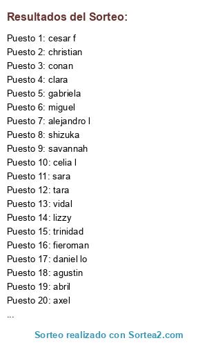 Lista de participantes: abel, abril, adalberta, adri, adrian, adrian p, adriana, agustin, ainhoa, aitana, aitor, alba m, alba madero, alba maria, alberto, alberto c, alberto g, alberto r, alejandro, alejandro l, alex, alex ro, alez sa, alicia r, alicia t, alina, allison, almudena, alvaro, amelia, amie, ana, ana 2, ana g, ana p, ana s, ana t, anas, andrea, andrea m, andrea r, anna, antonia, antonio, antonio j, ariadna, arianna, arsene lupin, aura, aurora, axel, ayla, ayla m, ayumi, bacterio, bacterio r, bart, basilio, beatriz, beatriz s, beatriz sa, bestiajez, blanca, blas, borja, bradlee, cai, camelia, cameron g, candela, carla, carlitos, carlos, carlos m, carolina, catalina, ceci, celia, celia g, celia gf, celia h, celia l, celia s, cesar, cesar f, christian, chule, clara, claudia h, conan, cristina, dani, daniel, daniel a, daniel l, daniel lo, daniel san, dario, david, davinia, diana, diego, diego g, diego h, eduardo, eduardo c, eduardo d, eilidh, el cabrito, elena, eloy, epi, erica, erik, erika, esperanza, esteban, esteban s, estefania, esther, esther n, estrella, fatima, fatima d, fatima f, fatima p, felicia, felix, fernanda g, fernanda m, fernando, fernando a, fernando d, fernando l, fernando t, fernominer, fieroman, filemon, flora, flora p, flora s, francisca a, francisca cristina, francisco finez, gabriel, gabriel 2, gabriel r, gabriela, gabriela l, gabriela s, gema, generoso, georghita, gertomaner, gesterredo, godofredo, gonzalo, gonzalo m, gorka, gustavo, haibara, haizea, hannah, harry h, hector, hugo, ibo, ignacio, imani, ines, ines j, ines r, inma, irache, irene, irene adler, irene s, ivan, ivan p, izan, jabato, jacinta, jack f, jade, jaira, javier, javier r, jemima, jenniffer, jenny, jeremy, jesus, jesus manuel, Jesus manuel p, jorge, jorge f, jorgina, jose antonio, jose antonio r, jose luis, jose luis i, josefa, josefran, juana, juanito, julia, julia h, julio c, julio cesar, just shut, karla, kelly, kevin, lachlan c, lara, laura, laura f, laura m, leon de las flores, lidia, lisa, livvy, lizzy, loli, lorena, lorena f, lucia, lucia p, lucia r, luisa, luisa mo, luisa r, manolo, manolo l, manuel, manuel jesus, manuel ramon, marcos, maria, maria a, maria angeles, maria del mar, maria dolores, maria i, maria jesus, maria jesus r, maria jose, maria madrid, maria teresa, maria teresa l, maria teresa r, mariana j, marina, marina l, marina r, mark, marta, marta 2, martin, mary, matilde, mazarro, miguel, miguel angel, miki, milhouse, millie, miriam, miriam 2, miriam d, miriam g, moriarty, mortadelo, mortadelo s, nando, natalia, nobita, noe, noelia, noemy, nuria, nuria s, oliver h, oliver r, olivia, oscar, oscar s, pablo, pablo s, paco, paco n, paloma, paloma j, paloma r, patricia, patricia g, pedro, pedro c, pedro manuel, pedro p, Pedro r, pepe, peter lawliet, petra, pilar, querubina, quiyo, rachel, rafael, ramon, ramón, raquel, raul, raul d, raul dr, raul n, reinoman, retomaner, ricky, risanor, roberto, roberto g, roberto s, roberto sa, rocio, rocio s, rodrigo, ruben, ruben p, ruben s, samantha, sammy, sancho, sandra, santi, santi lo, santi r, sara, sara d, sara dr, sara maria, savannah, selena, selma, serena, sergio, sergio s, sergio sa, sergio san, serromaner, sherlock holmes, shizuka, silvia f, sofia f, sofia g, sofia r, sofia t, stevie, suki, super, tahnny, tara, teresa, tomas, tomas 2, trinidad, tyson, unai, ursina, valentin, valero, vanesa, vicente, victor, vidal, viola, virginia, walfredo, walter, xaviel, xavier, zacarias, zenon, zoilo.