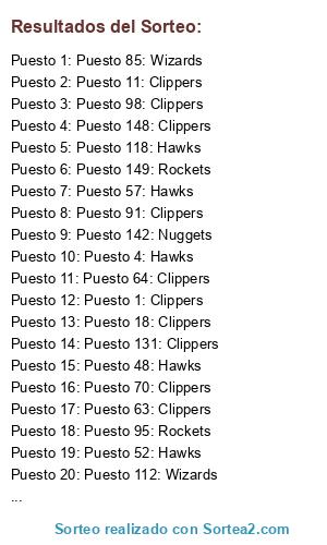 Lista de participantes: Puesto 1: Clippers, Puesto 2: Pelicans, Puesto 3: Clippers, Puesto 4: Hawks, Puesto 5: Clippers, Puesto 6: Clippers, Puesto 7: Clippers, Puesto 8: Hawks, Puesto 9: Nuggets, Puesto 10: Nuggets, Puesto 11: Clippers, Puesto 12: Clippers, Puesto 13: Nuggets, Puesto 14: Pelicans, Puesto 15: Clippers, Puesto 16: Clippers, Puesto 17: Nuggets, Puesto 18: Clippers, Puesto 19: Clippers, Puesto 20: Wizards, Puesto 21: Clippers, Puesto 22: Clippers, Puesto 23: Wizards, Puesto 24: Clippers, Puesto 25: Rockets, Puesto 26: Clippers, Puesto 27: Rockets, Puesto 28: Clippers, Puesto 29: Clippers, Puesto 30: Clippers, Puesto 31: Pelicans, Puesto 32: Hawks, Puesto 33: Clippers, Puesto 34: Clippers, Puesto 35: Clippers, Puesto 36: Nuggets, Puesto 37: Wizards, Puesto 38: Rockets, Puesto 39: Clippers, Puesto 40: Clippers, Puesto 41: Clippers, Puesto 42: Clippers, Puesto 43: Rockets, Puesto 44: Clippers, Puesto 45: Nuggets, Puesto 46: Rockets, Puesto 47: Clippers, Puesto 48: Hawks, Puesto 49: Nuggets, Puesto 50: Rockets, Puesto 51: Nuggets, Puesto 52: Hawks, Puesto 53: Nuggets, Puesto 54: Nuggets, Puesto 55: Pelicans, Puesto 56: Clippers, Puesto 57: Hawks, Puesto 58: Pelicans, Puesto 59: Clippers, Puesto 60: Nuggets, Puesto 61: Clippers, Puesto 62: Clippers, Puesto 63: Clippers, Puesto 64: Clippers, Puesto 65: Clippers, Puesto 66: Pelicans, Puesto 67: Rockets, Puesto 68: Nuggets, Puesto 69: Clippers, Puesto 70: Clippers, Puesto 71: Clippers, Puesto 72: Clippers, Puesto 73: Wizards, Puesto 74: Nuggets, Puesto 75: Clippers, Puesto 76: Nuggets, Puesto 77: Clippers, Puesto 78: Clippers, Puesto 79: Nuggets, Puesto 80: Clippers, Puesto 81: Clippers, Puesto 82: Nuggets, Puesto 83: Rockets, Puesto 84: Clippers, Puesto 85: Wizards, Puesto 86: Nuggets, Puesto 87: Nuggets, Puesto 88: Rockets, Puesto 89: Clippers, Puesto 90: Pelicans, Puesto 91: Clippers, Puesto 92: Hawks, Puesto 93: Clippers, Puesto 94: Rockets, Puesto 95: Rockets, Puesto 96: Clippers, Puesto 97: Wizards, Puesto 98: Clippers, Puesto 99: Rockets, Puesto 100: Nuggets, Puesto 101: Clippers, Puesto 102: Clippers, Puesto 103: Clippers, Puesto 104: Clippers, Puesto 105: Rockets, Puesto 106: Clippers, Puesto 107: Clippers, Puesto 108: Clippers, Puesto 109: Clippers, Puesto 110: Clippers, Puesto 111: Clippers, Puesto 112: Wizards, Puesto 113: Clippers, Puesto 114: Rockets, Puesto 115: Hawks, Puesto 116: Clippers, Puesto 117: Clippers, Puesto 118: Hawks, Puesto 119: Clippers, Puesto 120: Clippers, Puesto 121: Nuggets, Puesto 122: Nuggets, Puesto 123: Wizards, Puesto 124: Wizards, Puesto 125: Nuggets, Puesto 126: Clippers, Puesto 127: Nuggets, Puesto 128: Clippers, Puesto 129: Clippers, Puesto 130: Pelicans, Puesto 131: Clippers, Puesto 132: Clippers, Puesto 133: Rockets, Puesto 134: Clippers, Puesto 135: Clippers, Puesto 136: Clippers, Puesto 137: Hawks, Puesto 138: Clippers, Puesto 139: Clippers, Puesto 140: Clippers, Puesto 141: Clippers, Puesto 142: Nuggets, Puesto 143: Clippers, Puesto 144: Wizards, Puesto 145: Nuggets, Puesto 146: Wizards, Puesto 147: Clippers, Puesto 148: Clippers, Puesto 149: Rockets, Puesto 150: Pelicans, Puesto 151: Pelicans, Puesto 152: Clippers, Puesto 153: Rockets, Puesto 154: Clippers, Puesto 155: Clippers, Puesto 156: Clippers, Puesto 157: Wizards, Puesto 158: Rockets, Puesto 159: Clippers.